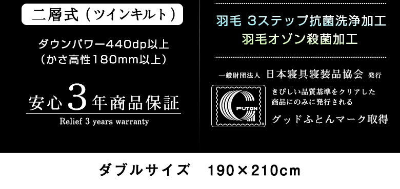 一番上にもどる 他のサイズ シングル セミダブル クイーン キング 商品企画 サイズダブル(190×210cm) 【羽毛について】 ・「ポーランド産ホワイトマザーグースダウン」を使用。